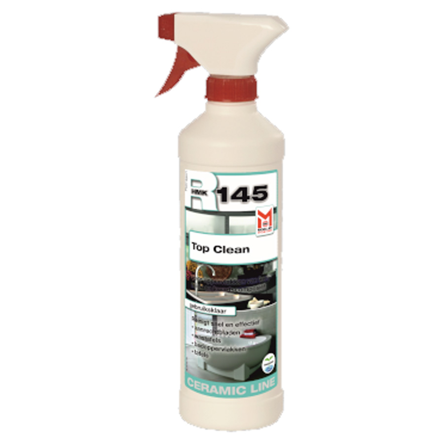Top Clean R145 Gebruiksklare reinigingsspray voor het dagelijkse of incidenteel reinigen van keramische tafels maar ook voor aanrechtbladen, wastafels, planken, toonbanken, vensterbanken en andere “kleine” oppervlakken gemaakt van keramiek en kwartscomposiet. De spray verwijdert moeiteloos nieuwe, verse en lichte verontreinigingen van het dagelijks leven, zoals olie- en vetresten, stof, zeepresten, enz.